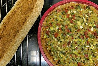 Das Brot und das zwiebelige Brot-Dings im Backofen (Umluft, vorgeheizt) bei ca 190° für ca 25 Min backen.