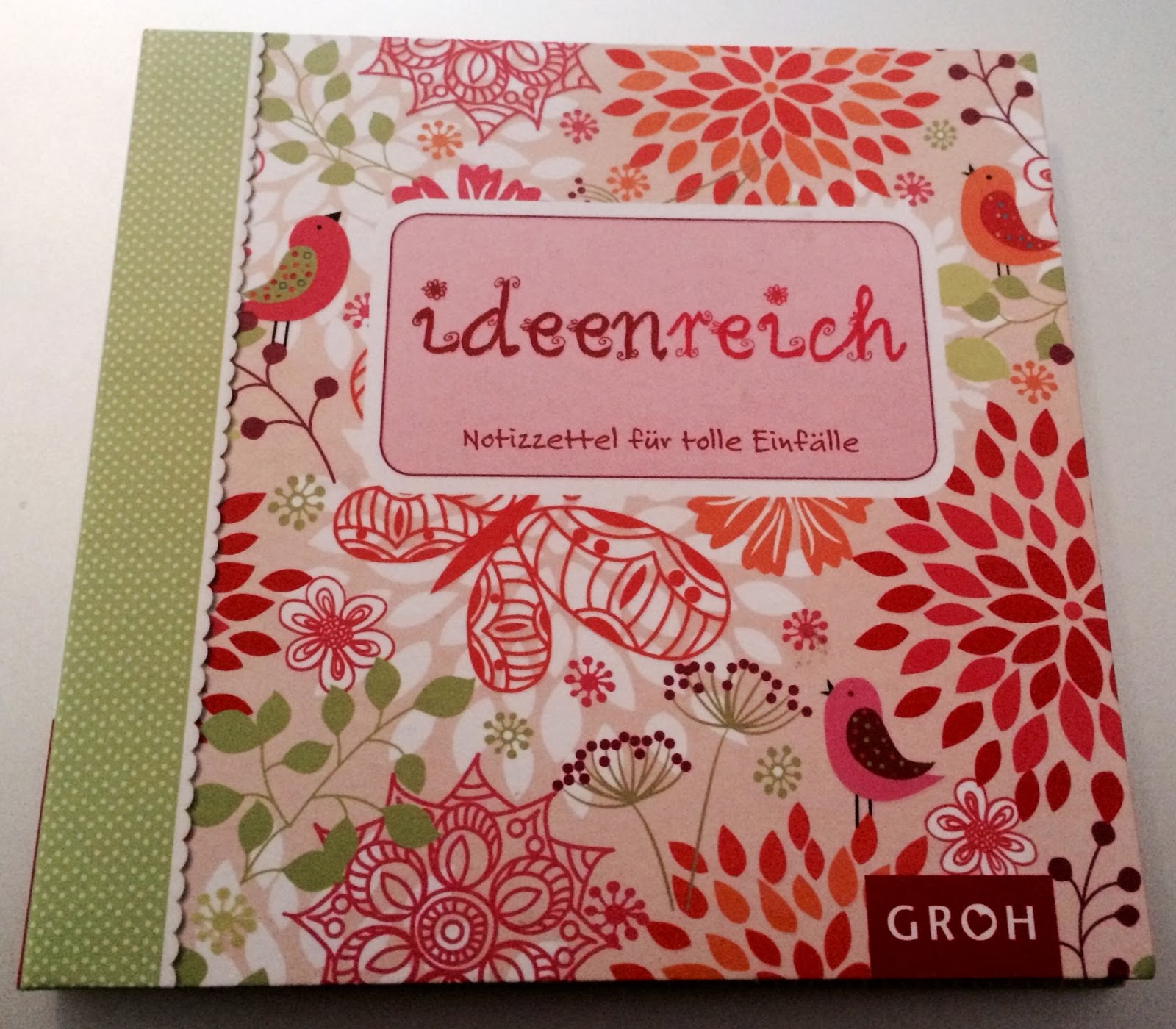 Das Büchlein ist sehr hübsch gemacht und hat innen auf der linken Seite größeren Seiten und auf der rechten Seite viele Post-its in verschiedenen Größen.