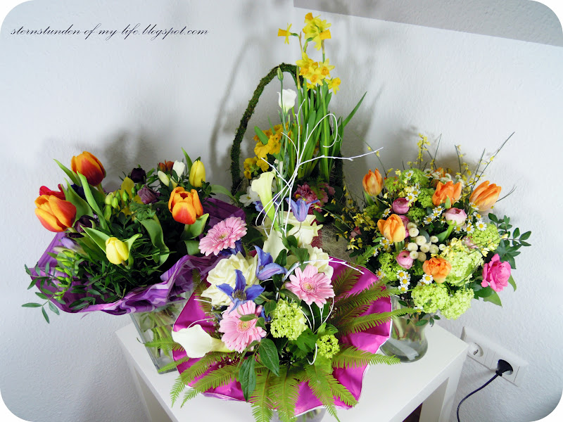 Der riesige Blumenkorb ist wunderschön. Eigentlich gehört er auf den Balkon, aber da ist es in der Nacht noch zu kalt.Ein schöner Geburtstag!