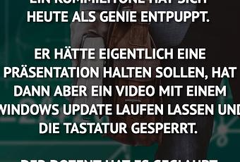 ER HÄTTE EIGENTLICH EINE PRÄSENTATION HALTEN SOLLEN, HAT DANN ABER EIN VIDEO MIT EINEM WINDOWS UPDATE LAUFEN LASSEN UND DIE TASTATUR GESPERRT.