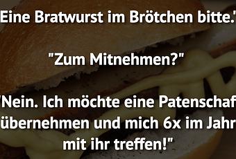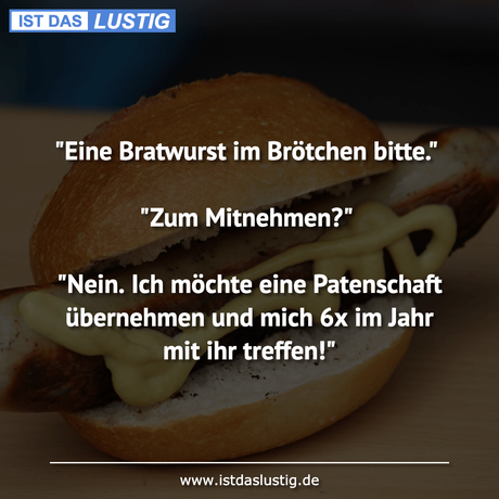 Auf Facebook teilen Vorige Folgende "Eine Bratwurst im Brötchen bitte." "Zum... Autor des Artikels : istdaslustig Zum Original-Artikel "Eine Bratwurst im Brötchen bitte." "Zum Mitnehmen?" "Nein. Ich möchte eine Patenschaft übernehmen und mich 6x im Jahr mit ihr treffen!" Hier geht es zum Artikel Mehr Lustiges auf www.istdaslustig.de Auf Facebook teilen Vorige Folgende Das könnte Ihnen gefallen Mehr