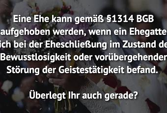 Auf Facebook teilen Vorige Folgende Eine Ehe kann gemäß §1314 BGB aufgehoben... Autor des Artikels : istdaslustig Zum Original-Artikel Eine Ehe kann gemäß §1314 BGB aufgehoben werden, wenn ein Ehegatte sich bei der Eheschließung im Zustand der Bewusstlosigkeit oder vorübergehender Störung der Geistestätigkeit befand. Überlegt Ihr auch gerade? Hier geht es zum Artikel Mehr Lustiges auf www.istdaslustig.de Auf Facebook teilen Vorige Folgende Das könnte Ihnen gefallen Mehr