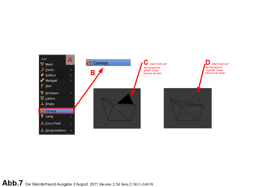 Befindet sich nur eine Kamera in der Szene, ist diese auch die aktive Kamera. Wenn sich nun aber mehrere Kameras in einer Szene befinden, wie weiß dann Blender, von welcher Kamera aus das Bild berechnet werden soll ? Blender berechnet immer das Bild der aktiven Kamera. Darum muss die gewünschte Kamera zur aktiven Kamera gemacht werden. Hierzu wird die gewünschte Kamera mit der rechten Maustaste ausgewählt. Mit der Kombination der Tasten Control und der Null auf dem Ziffernblock (Ctrl+ZB0) kann ich die gewählte Kamera aktiv schalten. Ob eine Kamera aktiv ist oder nicht ist an dem kleinen Dreieck auf der Kamera zu erkennen. Ist dieses gefüllt, ist die Kamera aktiv (Abb.7 C), ist es leer, ist die Kamera nicht aktiv (Abb.7 D).