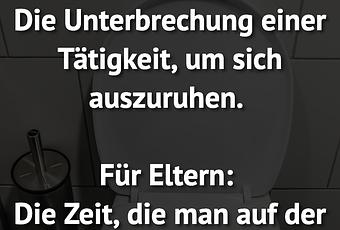Auf Facebook teilen Vorige Folgende Eine Pause ist eigentlich: Die Unterbrechung... Autor des Artikels : istdaslustig Zum Original-Artikel Eine Pause ist eigentlich: Die Unterbrechung einer Tätigkeit, um sich auszuruhen. Für Eltern: Die Zeit, die man auf der Toilette verbringt! Hier geht es zum Artikel Mehr Lustiges auf www.istdaslustig.de Auf Facebook teilen Vorige Folgende Das könnte Ihnen gefallen Mehr