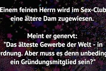 Auf Facebook teilen Vorige Folgende Einem feinen Herrn wird im Sex-Club eine ältere... Autor des Artikels : istdaslustig Zum Original-Artikel Einem feinen Herrn wird im Sex-Club eine ältere Dam zugewiesen. Meint er genervt: "Das älteste Gewerbe der Welt - in Ordnung. Aber muss es denn unbedingt ein Gründungsmitglied sein?" Hier geht es zum Artikel Mehr Lustiges auf www.istdaslustig.de Auf Facebook teilen Vorige Folgende Das könnte Ihnen gefallen Mehr