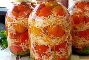 Große Einmachgläser (3 Liter) bereitstellen und die Zutaten schichten. Auf den Boden beliebige frische Kräuter legen, mit Tomaten belegen (diese könnt ihr ganz lassen, halbieren oder vierteln), die Weißkohl-Möhren-Mischung darauf geben und diesen Vorgang so lange wiederholen, bis das Glas voll ist.