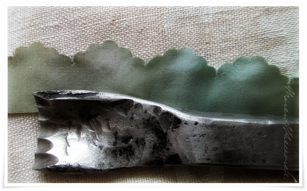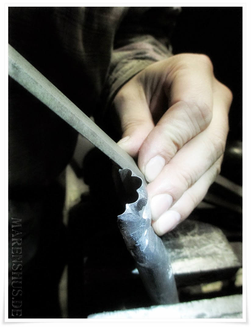 Und damit man mal sieht, dass nicht nur die Näharbeit Handsache ist: auch das benötigte Werkzeug (Zäckeisen / pinking tool) ist handgefertigt.