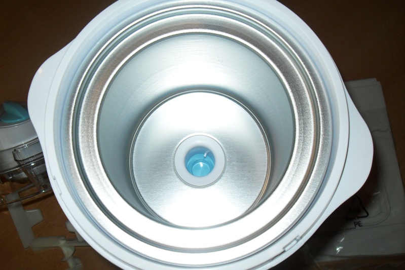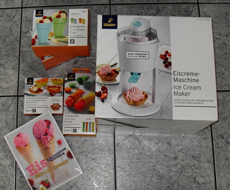 Ihr werdet in der nächsten Zeit auch noch einige Rezepte bei mir zum Thema finden, aber nun erst mal zu den Dingen, die dafür sorgen, das man seine Familie und Freunde immer wieder neu mit leckeren Ideen versorgen und überraschen kann.Eine herkömmliche und einfache Eismaschine befindet sich seit gut 15 Jahren in meinem Haushalt und sie macht auch leckeres Eis. Nun hat Tchibo wohl mein Flehen erhört und es gibt eine Eismaschine, die noch mehr kann...Eine Eiscreme-Maschine, die in nur 20 Minuten leckeres Softeis (!!), Sorbets oder auch Eis und Frozen Joghurt herstellen kann.Mein Traum kann nun auch zuhause erfüllt werden und ich kann jetzt schon sagen... das Teil steht hier nicht mehr still :-)Die Eiscreme-Maschine besteht aus mehreren Teilen und kann so ziemlich komplett zerlegt werden. Dies bietet schon mal folgende Vorteile:- einfache und gründliche Reinigung- platzsparende VerstauungDie herausnehmbare Gefrierschüssel besteht aus Metall und ist doppelt beschichtet und sorgt somit für ein optimales Gefrierergebnis.Das Fassungsvermögen der Schüssel beträgt max. 0,6 Liter und man muss die Schüssel für ca. 12 Stunden in den Gefrierschrank stellen. Ist in meiner Familie natürlich wieder mal viel zu lange, aber im Vergleich zu meiner alten Eismaschine schon ein kleines Wunder, denn diese Schüssel muss immer gleich für gute 24 Stunden eingefroren werden :-)Nun kam also die Eismaschine bei mir an und ich hatte natürlich nichts besseres zu tun, als sie genau unter die Lupe zu nehmen :-) Also Karton auf und ausgepackt.Im Nu war das Maschinchen aufgestellt und die Schüssel gespült und eingefroren.Mir gefällt die Optik der Eiscreme-Maschine auch außerordentlich gut und sie macht einen sehr netten Eindruck in meiner Küche. Auch meine Jungs fragten ganz erstaunt "Mama, was ist das denn?" :-)Als ich erklärte, was man damit machen kann, wurden sie ebenso ungeduldig wie ihre Mutter :-)Dann war es endlich soweit, die 12 Stunden waren um und wir konnten loslegen...Ich muss zugeben, ich nutzte erst einmal die fertigen Eiszubereitungen, die ich noch im Schrank hatte - aber Rezepte und Ideen, werdet ihr mit Sicherheit die nächsten Tage auch noch bei mir finden :-)Also... nach Packungsanweisung 500 g Erdbeeren püriert und aufgeschlagen mit der Zubereitung und erst einmal ab damit in den Kühlschrank. Ca. eine halbe Stunde vor unserem Abendessen habe ich dann die Eismaschine eingeschaltet und die Eismischung in den Einfüllstutzen gegossen.Es ist sehr wichtig die Eismischungen bei laufender Maschine einzufüllen, denn sonst gefriert die Masse bereits beim Einfüllen an den Rändern fest und der Rührarm kann sich nicht drehen. Und dieser ist sehr wichtig, schließlich soll ja das Eis locker, cremig und softig werden ;-)Nach dem Abendessen wurde dann meine Küche von den Kids belagert, denn schließlich mussten sie ja beobachten, wie das Eis unten aus der Maschine kommt. Exakte Erklärung des Vorganges musste natürlich auch sein :-) Was ist das für ein Hebel? Wo kommt das Eis heraus? Warum brauchst du den Portionierer nicht? Fragen über Fragen.... :-)An dieser Stelle möchte ich noch auf den "Hebel" eingehen, denn es ist wichtig darauf zu achten, das man den hebel während des Gefriervorganges (also schon vor dem Einfüllen der Eismischung) geschlossen hat, denn sonst läuft alles wieder unten heraus - ja, Dank meiner neugierigen Jungs ist mir dies auch direkt beim ersten Mal passiert :-)Das erste Eis wurde also von mir klassisch in einer fertigen Eistüte angerichtet und es war doch nicht so einfach, wie ich anfangs dachte :-) Nach der zweiten Eistüte hatte ich den "Dreh" heraus und wusste, wie ich das Hörnchen zu drehen habe, damit es auch optisch nett aussieht.Übrigens, die Eiscreme-Maschine muss während des gesamten Vorganges eingeschaltet bleiben, damit das Eis unten heraus gedrückt werden kann!!Da der Inhalt meiner Eismischung über das Maß von 0,6 Liter hinausging, habe ich natürlich nicht alles auf einmal hinein gegeben und da die Schüssel noch ausreichend gefroren war, habe ich den Rest auch noch eingefüllt.Nun hätte ich das restliche Eis einfach in eine Schüssel umfüllen können zum Einfrieren im TK Fach, aber da ich ja noch weitere Küchenspielereien von Tchibo erhalten habe, wurde gleich das nächste Produkt mit einbezogen :-) Und kleine Becherchen, die ich noch im Schrank hatte, wurden ebenfalls mit verwendet...Die Eismaschine erhält man für den wirklich günstigen Preis von nur € 34,95 und ich persönlich gebe sie garantiert nicht mehr her :-)Ein weiteres Highlight in der Themenwelt "Lass dir den Sommer schmecken...mit Eis, Saft und Smoothies" sind die 4 Eisbereiter.Mit diesen Eisbereitern kann man ganz einfach Wasser- und Milcheis zubereiten, in dem man Eismischungen oder Flüssigkeiten einfüllt, sie mit dem auslaufsicheren Deckel verschließt und sie ins Gefrierfach legt.Zum einen habe ich also den Rest aus der Eismaschine in einen Eisbereiter gefüllt und zum anderen wurden Saftreste genommen und ebenfalls in die Eisbereiter gefüllt - eine wirklich geniale Resteverwertung für unseren Haushalt!!Am nächsten Tag war das Staunen meiner Kinder groß als ich sie fragte, ob sie ein Eis möchten und ich ihnen die Eisbereiter in die Hand drückte :-) Die Eisbereiter sind übrigens aus geschmacksneutralem Silikon, geeignet für Temperaturen von -20 bis +230 Grad und man kann sie auch in die Spülmaschine geben.Für den Preis von € 9,95 wirklich toll - denn man spart sich nicht nur Verpackungsmüll, sondern kann immer wieder schnell und einfach Eis zubereiten. Ich überlege mir sogar schon, noch einen weiteren 4er Pack zuzulegen, damit ich immer genug Eis zur Hand habe, wenn auch mal Freunde meiner Jungs zu Besuch da sind.So, manchmal muss es aber auch mal ein großer >Eisbecher sein... :-) Am besten mit viel Frucht und Sahne oben drauf und damit das Sommerfeeling stimmt, sollte man so einen riesen Eisbecher natürlich stilgerecht servieren können :-) Ja