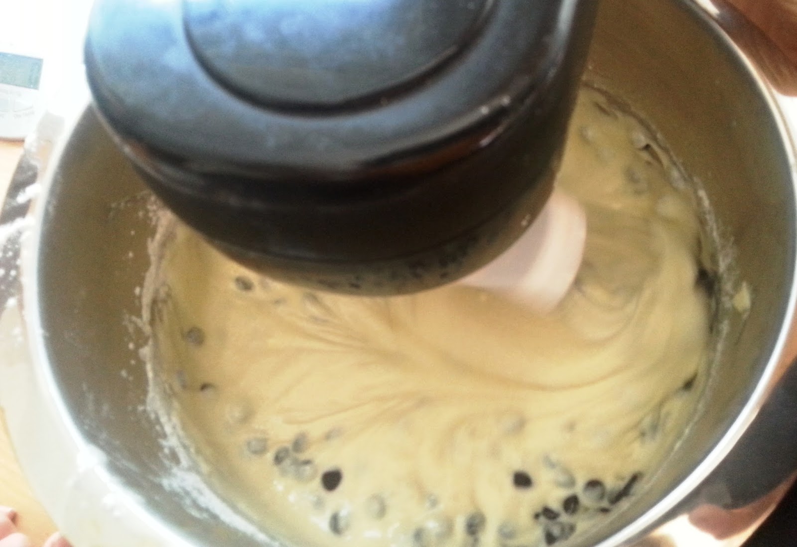 Zuletzt die Schokoladentropfen unterheben (bis auf ca. 1 EL, der später noch benötigt wird).