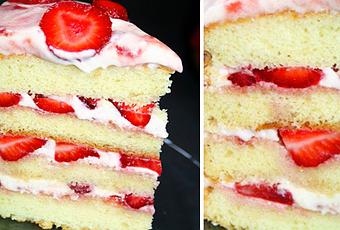 Erneut einen Becher Sahne mit einem Beutel Sahnesteif sehr steif schlagen. Das Erdbeerpüree einrühren, evtl. mit Puderzucker und/oder Zitronensaft abschmecken. Die Sahne evtl. noch etwas kühl stellen, falls sie noch nicht ganz standfest ist. Die Sahne dann auf den zweiten Streifen streichen und den dritten Streifen darauf legen. Leicht andrücken und kühl stellen.