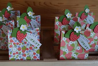 Weiter geht es mit den Verpackungen aus dem Designerpapiervorrat. Bevor die Erdbeerzeit sich dem Ende zuneigt, gibt es kleine Auszeit-Tüten, gefüllt mit Erdbeer-Peeling-Maske, Erdbeerschokoriegel, Erdbeer-Rhabarber-Likörchen und einem Teelicht mit Erdbeerduft................