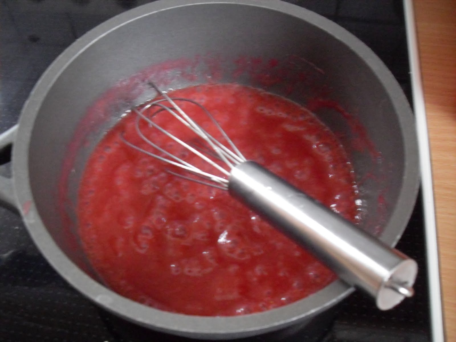 Dann habe ich die Masse in einen Topf gegeben, den Zucker hinzugefügt und alles aufgekocht. Geköchelt wurde ca. 2-3 Minuten bis es sämig wurde.