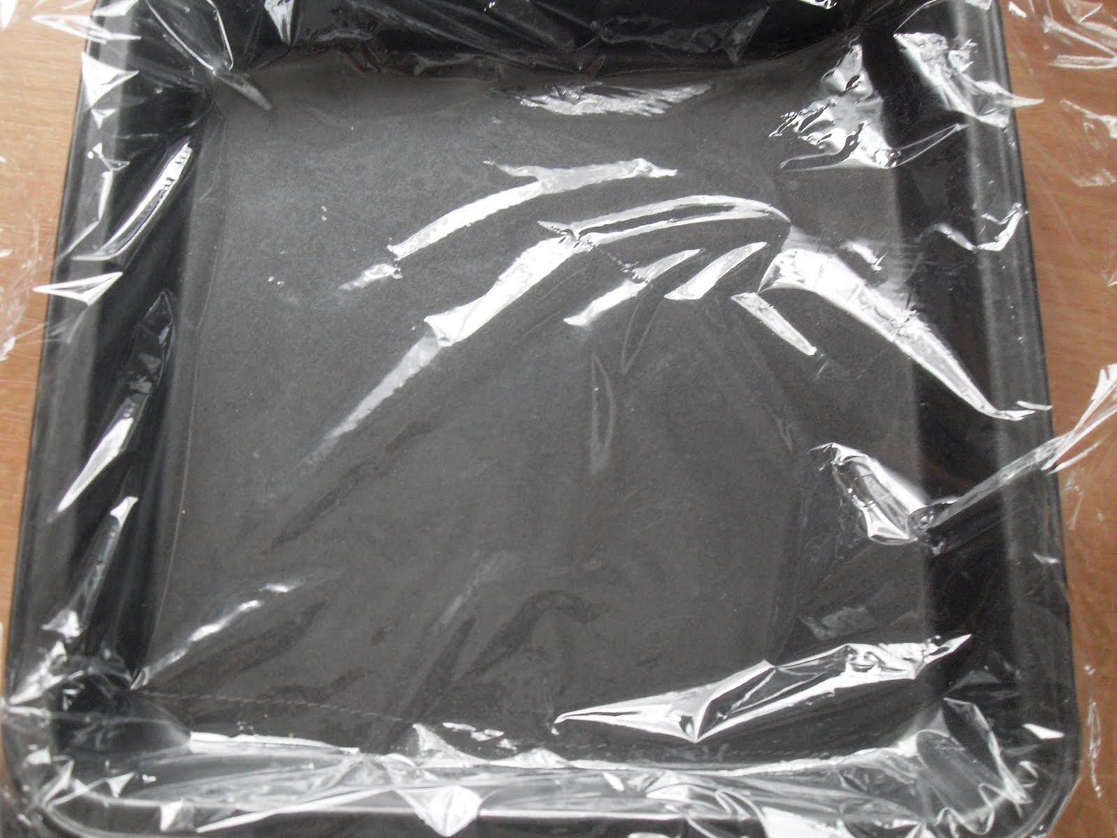 Während alles abkühlte habe ich eine kleine Blechform mit Folie ausgekleidet.