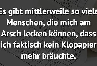 Auf Facebook teilen Vorige Folgende Es gibt mittlerweile so viele Menschen, die... Autor des Artikels : istdaslustig Zum Original-Artikel Es gibt mittlerweile so viele Menschen, die mich am Arsch lecken können, dass ich faktisch kein Klopapier mehr bräuchte. Hier geht es zum Artikel Mehr Lustiges auf www.istdaslustig.de Auf Facebook teilen Vorige Folgende Das könnte Ihnen gefallen Mehr