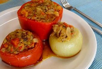 Die rohen Zwiebeln aushöhlen, das geht mit einem gezahnten Messer ganz gut. Die Tomaten und die Peperoni köpfen und das Innere heraus klauben. Und nicht vergessen, den Gemüsen auch eine kleine Standfläche zu schneiden. Die Gemüse-Innereien und etwas Knoblauch kleinschneiden, mit Rosmarin, Tymian und Pfeffer würzen und leicht anbraten. Eine Handvoll kleine Brotwürfel in den Gemüsemasse geben und kühl stellen.