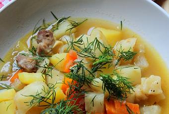 Zwiebeln schälen und fein hacken. Mit gewürfelte Fleisch und Butter in einem Topf geben. Bei mittlere Hitze ca. 20 Minuten kochen, dabei ab und zu rühren. Inzwischen Sellerie, Kartoffeln und Möhren schälen, in Würfeln schneiden, zum Topf geben. ca. 700 ml heißes Wasser zugießen. Salzen und pfeffern. Zum Kochen bringen, dann die Hitze reduzieren und zugedeckt ca. 20 Minuten köcheln lassen, bis die Gemüse weich sind. Vom Topf eine Kelle Brühe nehmen, Mehl darin lösen lassen und zurück zum Topf geben. Noch eine Kelle Brühe nehmen und mit leicht verquirlte Eigelb rühren und wieder zurück in den Topf gießen. Weitere 5 Minuten köcheln lassen. darüber fein geschnittene Dill bestreuen und servieren.