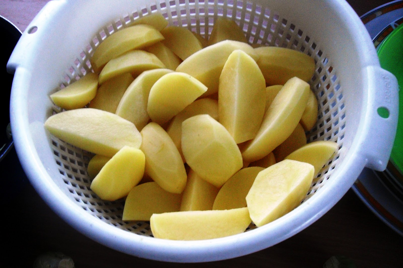 Zutaten:800 g Schweinefilet (Köpfe)800 g Kartoffeln (maximal mittelgroß)bunt gemischtes Gemüse nach Geschmack (hier Brokkoli, Erbsen & Möhren, Champignongköpfchen, Rosenkohl)1 Päckchen Sauce Hollandaise (z.B. von Knorr)etwas Öl zum Braten)Salz, frisch gemahlener schwarzer PfefferZubereitung:Die Kartoffeln schälen und in Spalten schneiden.