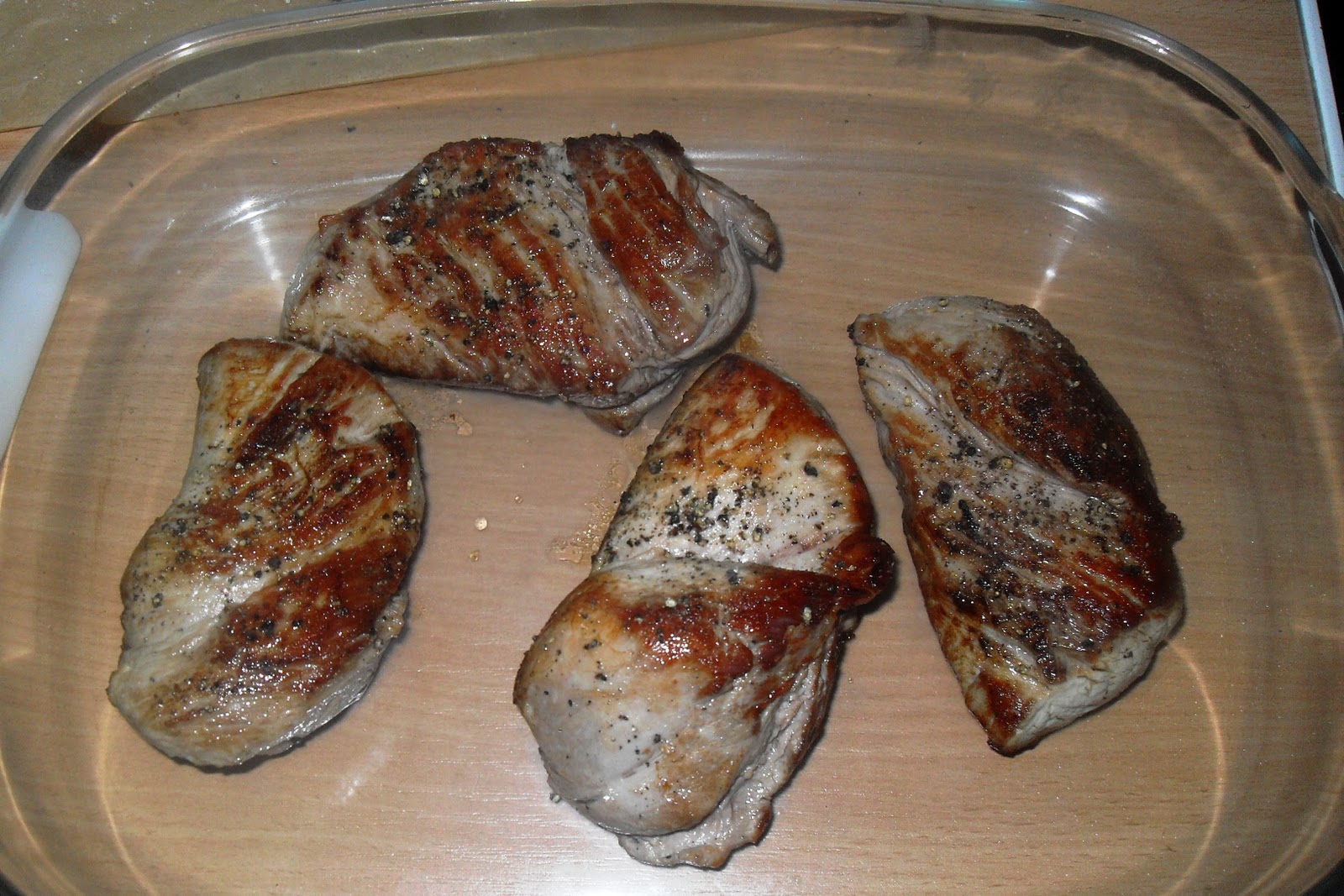 In einer weiteren Pfanne wird das Fleisch dann von allen Seiten scharf angebraten, mit Salz und frisch gemahlenen schwarzem Pfeffer gewürzt und bis zur Fertigstellung in eine Auflaufform gelegt (benötigt man auch später zum Anrichten) und in den Backofen (vorgeheizt 180 Grad Ober-/Unterhitze) geschoben. Es sollte ca. 10-15 Minuten im Ofen "nachziehen).