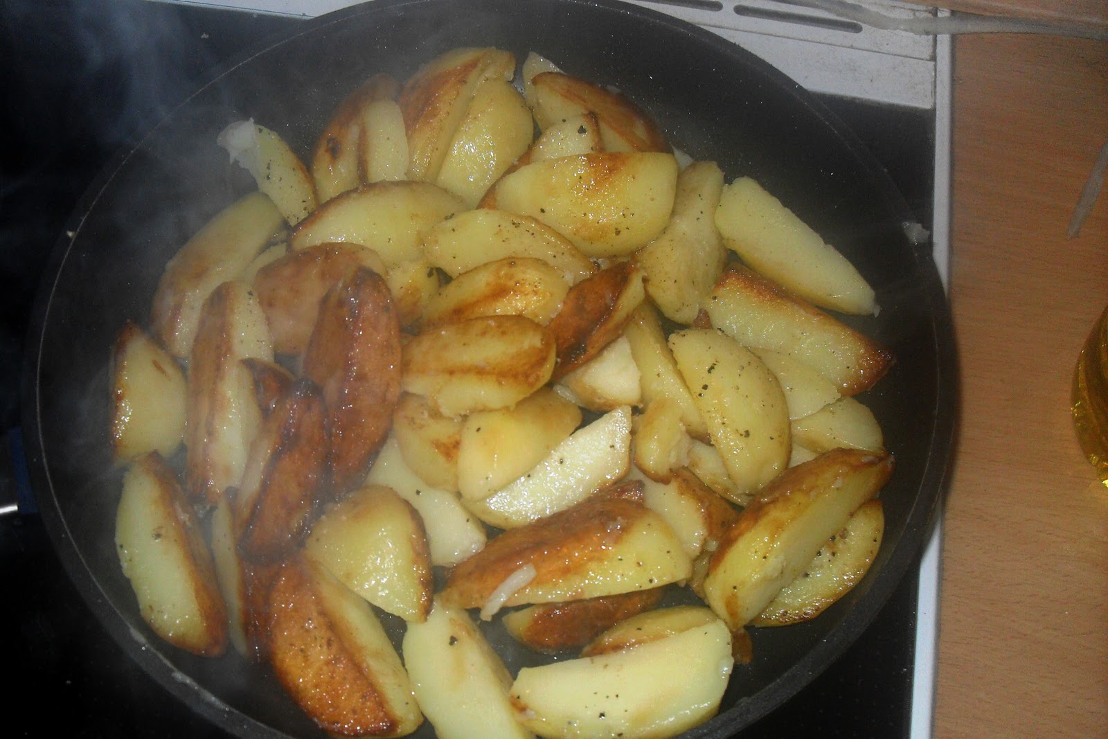 In einer großen Pfanne ca. 2 EL Öl ehitzen und die Kartoffeln in ca. 20 Minuten braun und gar braten. Mit Salz und frisch gemahlenem schwarzen Pfeffer würzen.