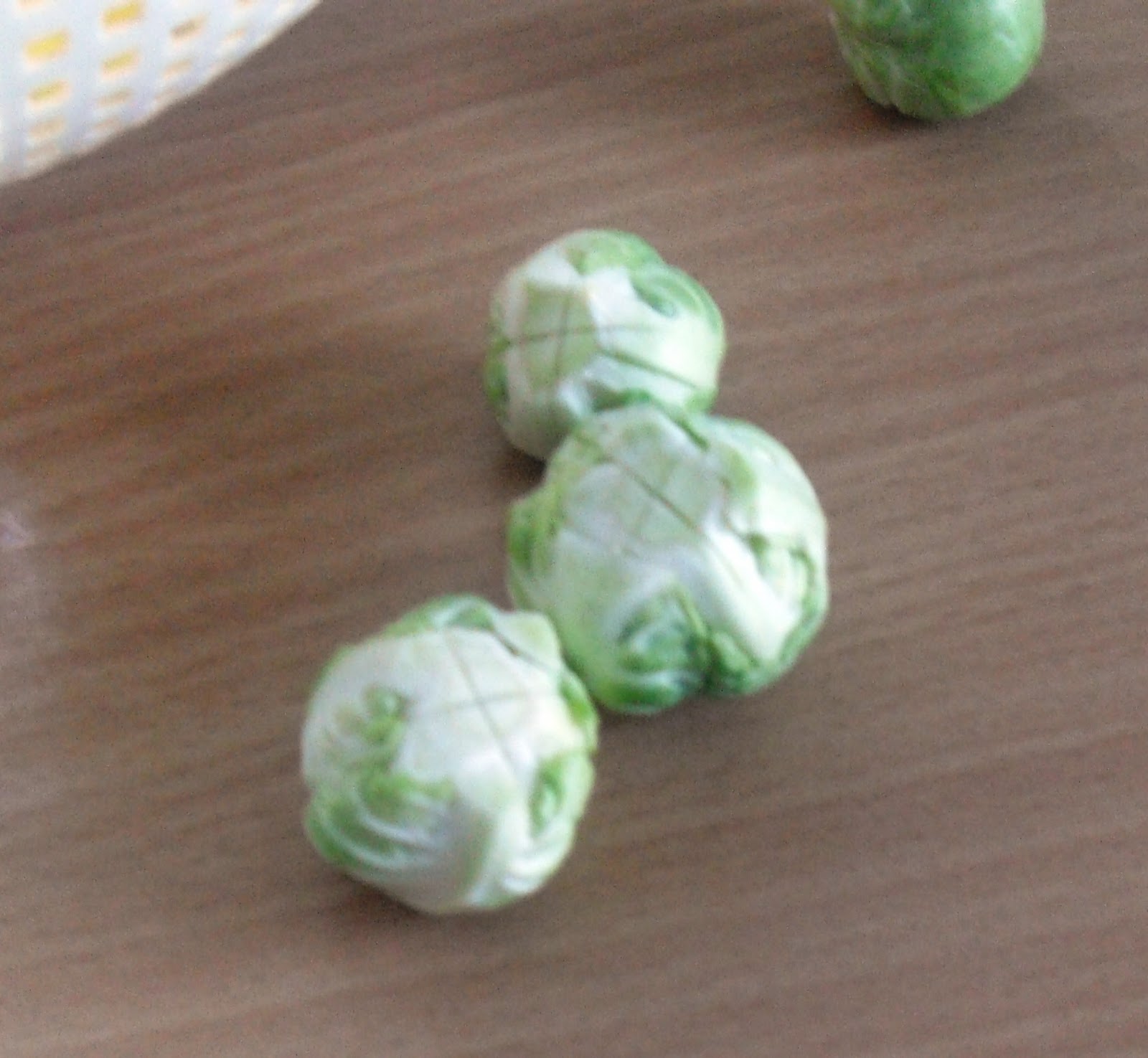 Das Gemüse wird zwischendurch gegart bzw. erwärmt. Da man hier absolut freie Hand hat und nach Geschmack sämtliche Gemüsesorten nehmen kann, kommt es auf die einzelnen Garzeiten an. Ich habe hier heute frischen Brokkoli und Rosenkohl genommen. Den Brokkoli gesäubert und in Röschen geteilt und ihn zwischendurch in etwas Salzwasser gegart. Den Rosenkohl von den äußeren Blättern befreien und unten kreuzweise einritzen und dann ebenfalls in etwas Salzwasser gar ziehen lassen.