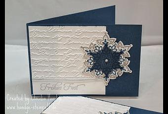 Diese schlichte Weihnachtskarte in Mitternachtsblau, Silber & Flüsterweiß haben wir ebenfalls gestempelt.