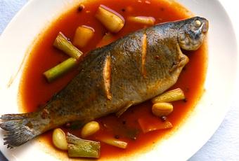 Öl in einer großen Pfanne bei mittlerer Hitze erhitzen. Sichuan-Pfeffer hineingeben und kurz unter Rühren anrösten. Dann Knoblauch, Ingwer, Frühlingszwiebeln und Chili zugeben und alles unter Rühren eine Minute braten. Chili-Bohnen-Paste zugeben und mitrösten, bis es schön duftet. Nun mit dem heißen Fischfond ablöschen, Zucker und Sojasauce zugeben. Alles aufkochen, dann die Forellen in die Pfanne legen. Deckel aufsetzen und alles bei milder Hitze 8 min köcheln lassen. Dabei immer wieder mal etwas von dem Sud auf die obere Seite der Fische gießen.