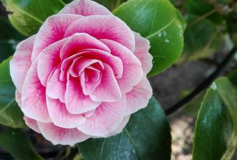 Es sieht fast aus wie eine Rose, ist aber eine asiatische Kamelie, die in meinem Garten wächst. Man kann es gut an den Blättern erkennen, die nicht wie bei Rosen gesägt sind, sondern einen glatten Rand haben.