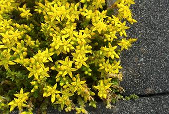 Auf dem flachen, mit Kies oder Platten belegten Dach des Forums Lüdinghausen wachsen allerlei interessante Pflanzen mit schönen Blüten. Dieses gelbe Gewächs könnte ein Steinbrech sein.