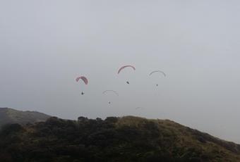 Durch Dunst und Nebel kämpfen sich auf diesem Bild sechs Paraglider über einen Hügel in den Niederlanden. Den fünften und den sechsten sieht man aber erst, wenn man das Bild mehrmals anklickt und damit vergrößert.