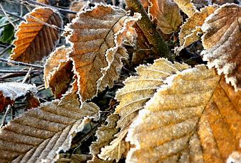 Man merkt nicht nur an den Temperaturen, dass es kälter geworden ist. Auch das Glitzern dieser mit Raureif überzogenen Blätter einer Buchenhecke zeigt an, wie kalt es geworden ist – macht aber auch Hoffnung auf eine Runde Schnee zum Jahreswechsel.