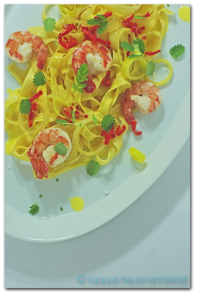 Erst die Nudeln in einen Teller geben, darauf etwas von der Sauce , dann den Lauch mit Chili verteilen. Die Garnelen auf die Pasta setzen und mit den Blättchen vom Kleinen Wiesenknopf bestreuen.