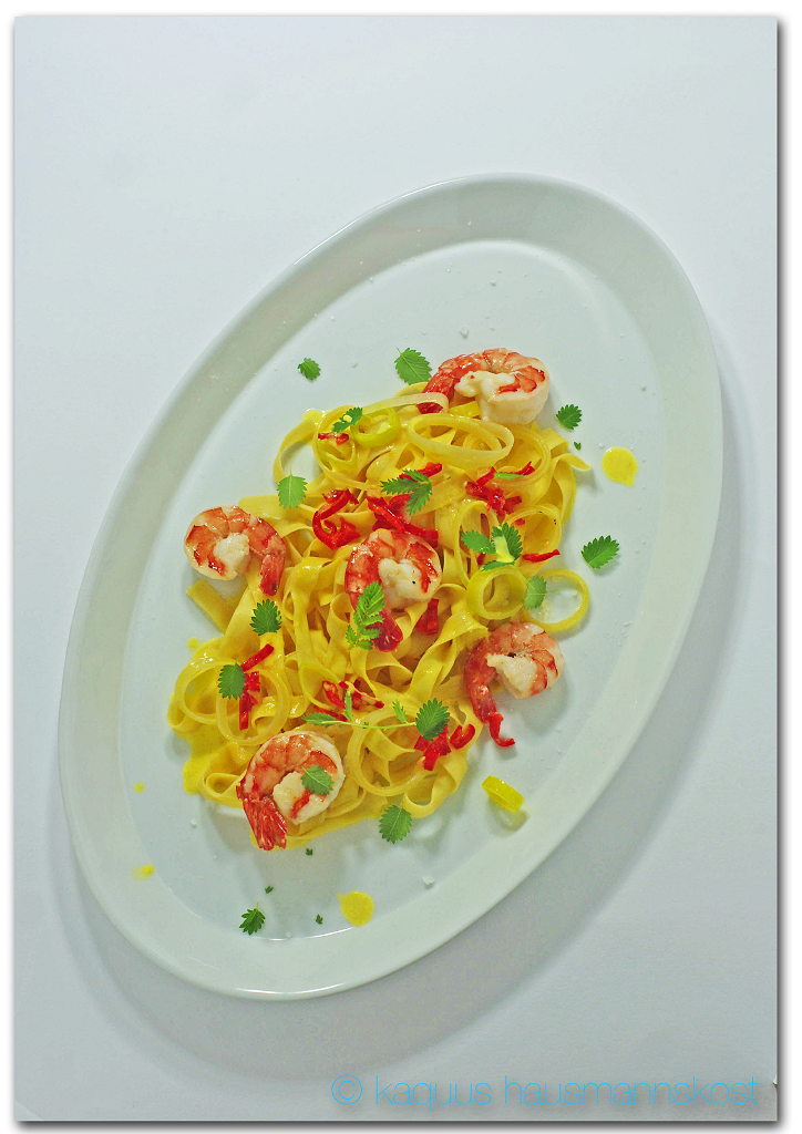 Natürlich koche ich keine drei Gänge wenn ich alleine bin. Doch was verbünftiges essen will ich schon. Wenn Frau K auswärts ist bietet es sich natürlich an Sachen zu kochen die sie sonst eher verschmäht. Dazu gehört auch Safran, Safran mag Frau K nicht.Also gab es Nudeln mit Safran.