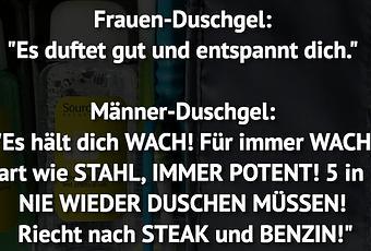 Auf Facebook teilen Vorige Folgende Frauen-Duschgel: "Es duftet gut und entspannt... Autor des Artikels : istdaslustig Zum Original-Artikel Frauen-Duschgel: "Es duftet gut und entspannt dich." Männer-Duschgel: "Es hält dich WACH! Für immer WACH! Hart wie STAHL, IMMER POTENT! 5 in 1, NIE WIEDER DUSCHEN MÜSSEN! Riecht nach STEAK und BENZIN!" Hier geht es zum Artikel Mehr Lustiges auf www.istdaslustig.de Auf Facebook teilen Vorige Folgende Das könnte Ihnen gefallen Mehr