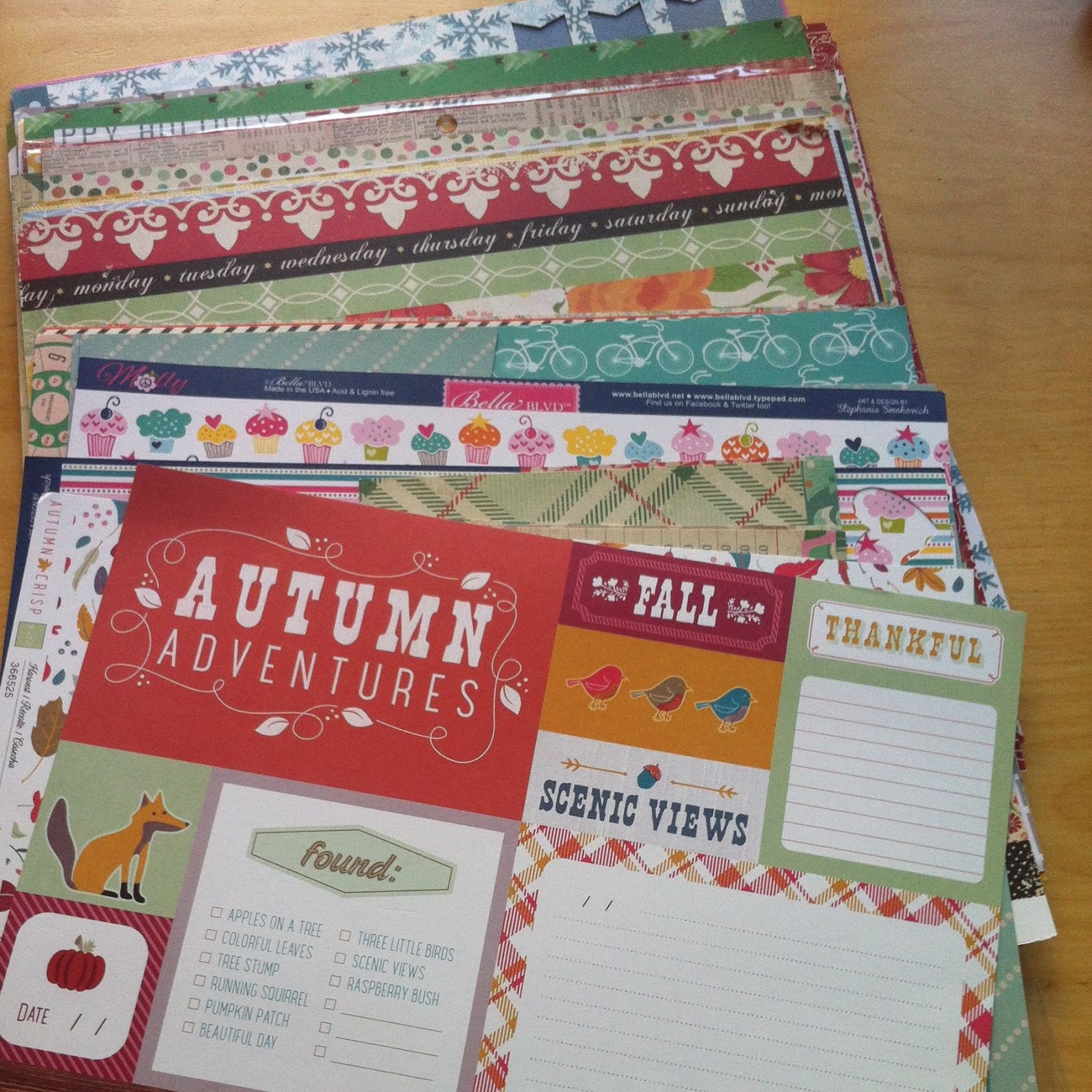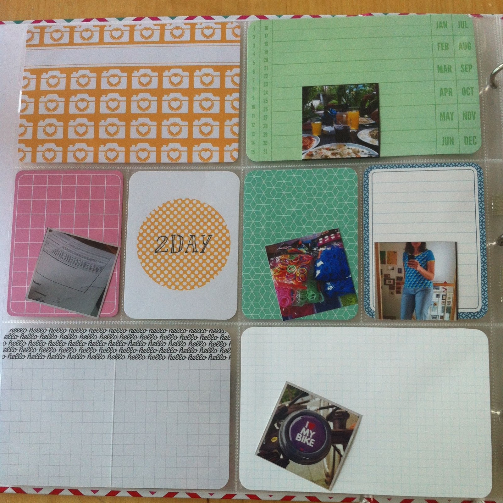 Ich habe mir ein paar Stempel gekauft und Aufkleber und probiere nun ein wenig rum. Ich versuche nicht zu viele verschiedene Farben bei den Karten und Stempelfarben einzusetzen. Ich finde es schwierig für die 4x6-Plätze, die ich nur mit 3x4 Fotos oder quadratischen Fotos bestücke, zurückhaltende Karten auszusuchen, die nicht versuchen, das Gesamtbild zu dominieren. So schneide ich mir jetzt Scrapbookingpapier (meine Güte ist das alles schön!!) zurecht, das funktioniert besser als fertige Karten auszuwählen.