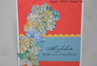Im Moment haben wir ja kein schönes Wetter und da habe ich mir gedacht, mit frischen Farben zu arbeiten, vielleicht kann ich damit ja die Sonne locken. Diese Karte ist in den Farbtönen Flüsterweiß, Calypso, Baiblau und Osterglocke gebastelt. Die Blüten sind mit dem Stempelset Secret Garden und den passenden Framelits-Formen entstanden. Eine kleine Borte mit der Wellenstanze ankleben und mit ein paar Perlen versehen, schon ist die Karte fertig.