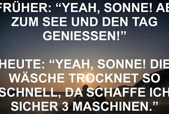 Auf Facebook teilen Vorige Folgende FRÜHER: “YEAH, SONNE! AB ZUM SEE UND DEN TAG... Autor des Artikels : istdaslustig Zum Original-Artikel FRÜHER: “YEAH, SONNE! AB ZUM SEE UND DEN TAG GENIESSEN!” HEUTE: “YEAH, SONNE! DIE WÄSCHE TROCKNET SO SCHNELL, DA SCHAFFE ICH SICHER 3 MASCHINEN.” Hier geht es zum Artikel Mehr Lustiges auf www.istdaslustig.de Auf Facebook teilen Vorige Folgende Das könnte Ihnen gefallen Mehr