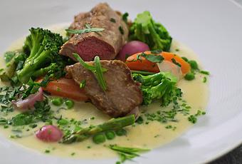 Zutaten für 2:2 Lammfilets Butterschmalz1 El Mehl2 El Butter100 ml Noilly Prat400 ml Gemüsefond100 ml Sahne1 Lorbeerblatt1 Tl Worcestershire-SaucePiment d’ Espelette 1/2 Zitrone3 Bund-Möhren1 Kohlrabi8 Stangen grüner Spargel8 Radieschen 80 g Zuckerschoten100 g Brokkoli100 g TK-Erbsen3 Stiele Petersilie1/2 Bund SchnittlauchEstragonZubereitung:Zwei El Butter in einem Topf kurz aufschäumen lassen. Ein El Mehl zugeben und gut verrühren. Jetzt den Gemüsefond, Noilly Prat und die Sahne zufügen. Die Sauce gut verrühren, das Lorbeerblatt zufügen und alles etwa 30 Minuten leise köcheln lassen. Dabei immer mal wieder umrühren und aufpassen das die Sauce sich nicht am Topfboden fest setzt.Den Backofen auf 60°C vorwärmen. Die Lammfilets von allen Seiten gut salzen und in heissem Butterschmalz vorsichtig etwa 2 Minuten von jeder Seite leicht anbraten, dann im Backofen ziehen lassen.