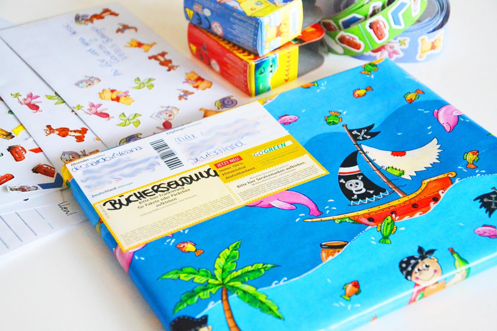 Damit unsere Geschenk und unsere Briefe natürlich kunterbunt auffallen =) haben wir mit tollem Piraten Geschenkpapier und bunten Stickern gearbeitet die wir noch in unserem Bastelschrank gefunden haben.