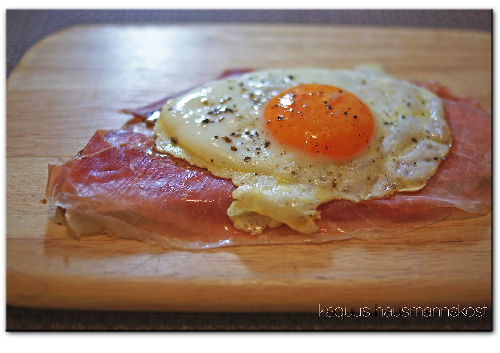 Auf das Brot dann Butter und Schinken, wobei ich da meist einfachen, luftgerockneten Schinken von meinem Metzger nehme. Dann das Spiegelei darauf und mit Salz und grob gemahlenem Pfeffer würzen.Dazu gab es einen Salatteller und wir hatten ein schönes Abendbrot und gekocht habe ich ja auch.