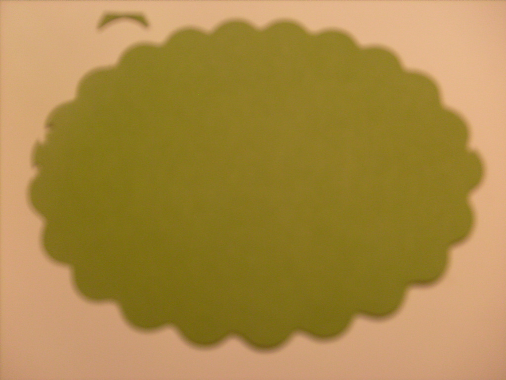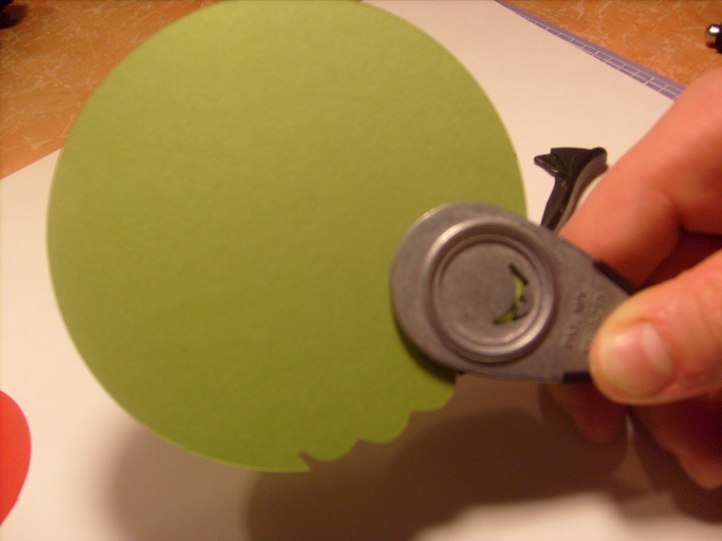 Nehmt nun den größten der 3 Kreise, bei mir ist es der in Olivegrün und den Eckenabrunderund dreht den Stanzer so, daß ihr seht wo ihr stanzt.Nun führt ihr den Kreis in den Stanzer ( wie auf dem Bild ) daß der Rand des Kreises genau an dem kleinen 'V' anlegt und stanzt nun die erste ' Welle'.