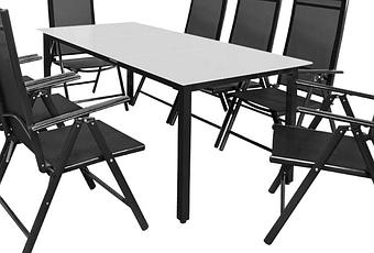 Die Sitzgruppe besteht aus hochwertigem Aluminium und atmungsaktivem Outdoor Gewebe. Sie eignet sich perfekt für den Balkon, Terrasse und für den Garten. Die Sitzgruppe zeichnet sich zudem durch einen hohen Sitzkomfort und eine stabile Ausführung aus. Der Rahmen ist wetterfest, die Schrauben bestehen aus Edelstahl und sind rostfrei. Die Rückenlehne ist siebenfach verstellbar. Der Tisch ist dreifach geteilt und die Platte ist fünf Millimeter dick.