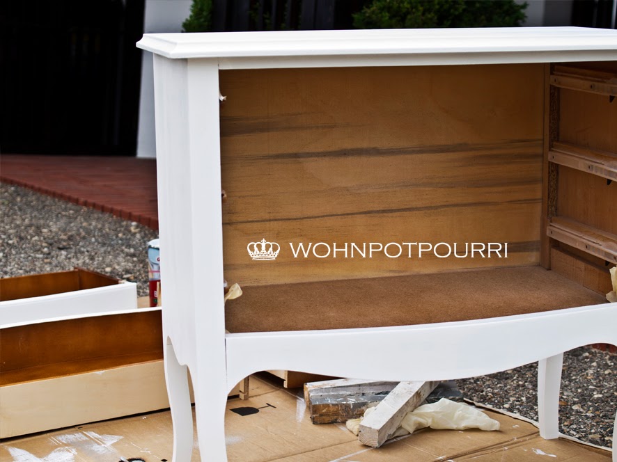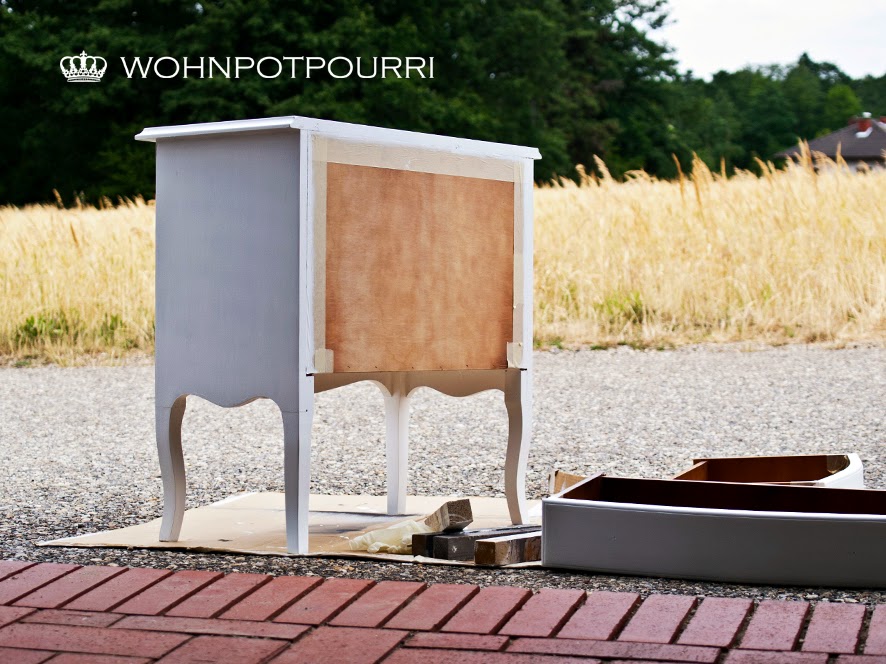 Danach nahm er mir die Laden, Beschläge und Griffe ab. Ich dachte nur: "Bitte nimm mir die nicht weg, ich häng an ihnen :-(" Doch als er mich dann mit einer schönen Grundierung und einem weichen Pinsel bearbeitete, beruhigte ich mich schnell wieder.