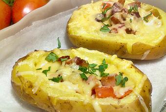 Ofen vorheizen (E-Herd: 220 °C/Umluft: 200 °C/Gas: s. Hersteller). Ein Backblech mit Backpapier auslegen. Kartoffeln längs halbieren. Das Fruchtfleisch, bis auf ca. 1 cm Rand, rundum mit einem Teelöffel herauslösen. In einer Schüssel mit einer Gabel zerdrücken. Ei und Schmand unterrühren.