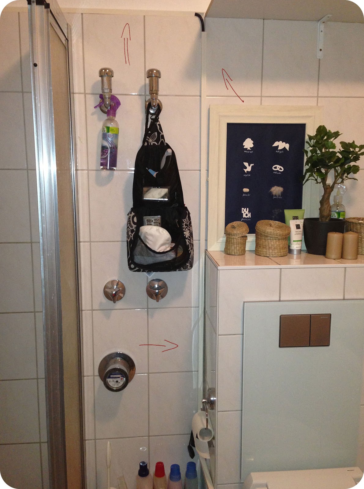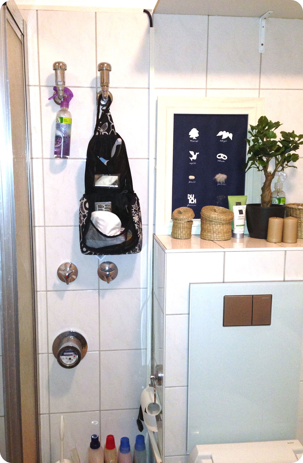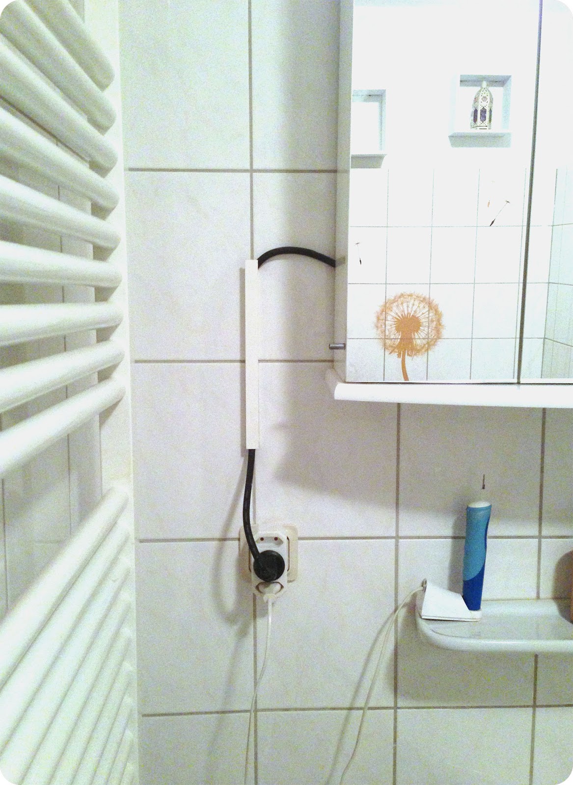 Bis dato lag nämlich ein dickes, schwarzes Kabel auf dem Boden, quer durch das Badezimmer. Damit es keine Stolperfalle darstellte, wurde es von einem großen Handtuch überdeckt. Natürlich war das keine Dauerlösung und sah einfach scheisse aus :-D Da wir aber nur e i n e Steckdose im Bad haben, gab es (neben dem Aufreißen der Fliesen um Strom zu verlegen oO) nur diese Lösung. ;)Also haben wir Kabelschächte im Baumarkt gekauft.Komplett verstecken ließ es sich leider nicht, wobei mich das nicht weiter stört. Lediglich das Endstück (an der Steckdose) hätte schöner aussehen können. Mein Freund musste hinter dem Spiegelschrank mehrere Bahnen Kabel legen, weil es einfach zu lang war.So, hier die versteckten Kabel: