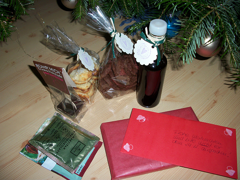 Schweren Herzens habe ich bis 24.12. gewartet und dann folgendes ausgepackt:(Die Kinder-Schoko war so zerdeppert, dass wir sie gleich vertilgt haben ;-))