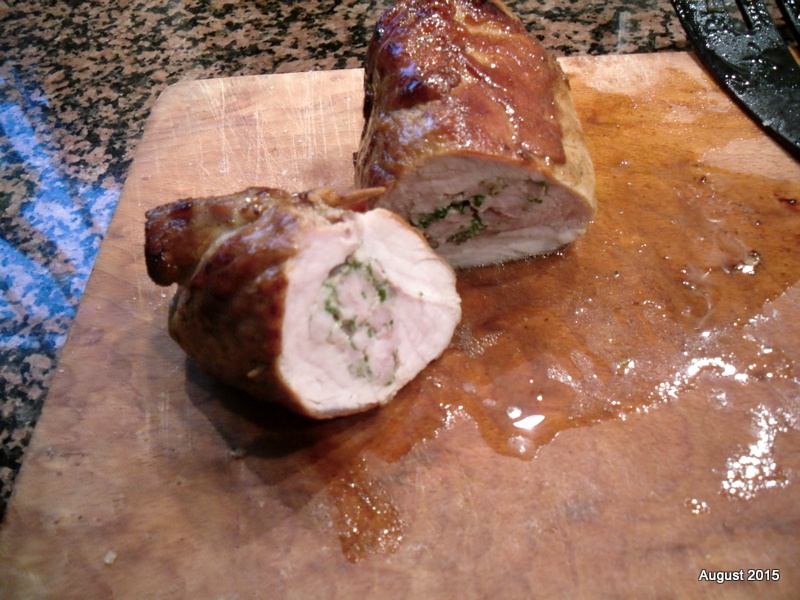 Meine Abwandlung musste sein: Hier in Spanien ist es ungleich schwieriger, einen Rinderbraten oder Rinderhüfte zu kaufen, noch dazu am Dienstag. Die Fleischstücke sind hier allemal Filet oder Entrecota. Beides war nicht vorrätig. In der Auslage des Metzgers lachte mich dafür ein Solomillo (Schweinefilet) und das wurde ähnlich zubereitet. Der Unterschied zum Schmetterlings-Steak war eigentlich der Grund, dass ich außen das Fleisch geschlossen halten wollte und deshalb eine Tasche hineinschnitt. Sie wurde dann mit Zitronensalz gewürzt, mit den gehackten Abschnitten, Kräutern und einer gepressten Knoblauchzehe gefüllt. Schnell noch außen gewürzt und ... für ca. 2 Stunden abgedeckt im Kühlschrank vergessen! Angebraten und nebenbei noch schnell den Salat zubereitet, dabei die falsche Herdplatte für das Nudelwasser angeschaltet wurde dann ein leckeres Menü aus dem Essen. Die Frischkäse-Creme von lieberlecker gab's noch hinterher - allerdings nur mit frischem Pfirsich) und krönte unser Festmahl.