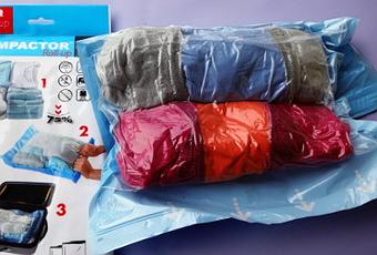 Die Kleider sind vakuumiert, bleiben sauber und nehmen weinig Platz weg. Und weil die Beutel durchsichtig sind, sieht man bereits im Voraus, was man anzieht.