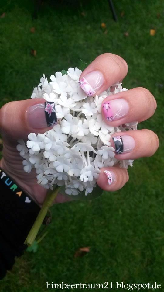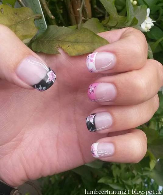 Ich habe mich für ein Blumenmuster entschieden.Wie ihr seht habe ich die Farben immer abgewechselt mal French in weiß oder pink oder schwarz dafür die Blumen in weiß-schwarz, pink-weiß und pink-schwarz.