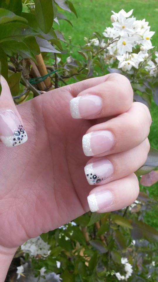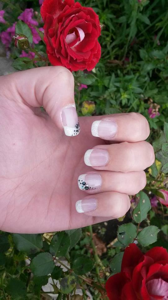 Ich habe mir den French weiß gewünscht mit Glitzer.An dem Daumen und am Ringfinger wurden seitlich schwarze Punkte drauf getupft und zusätzlich noch etwas mehr Glitzer drauf gemacht.
