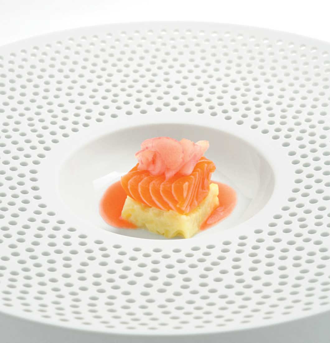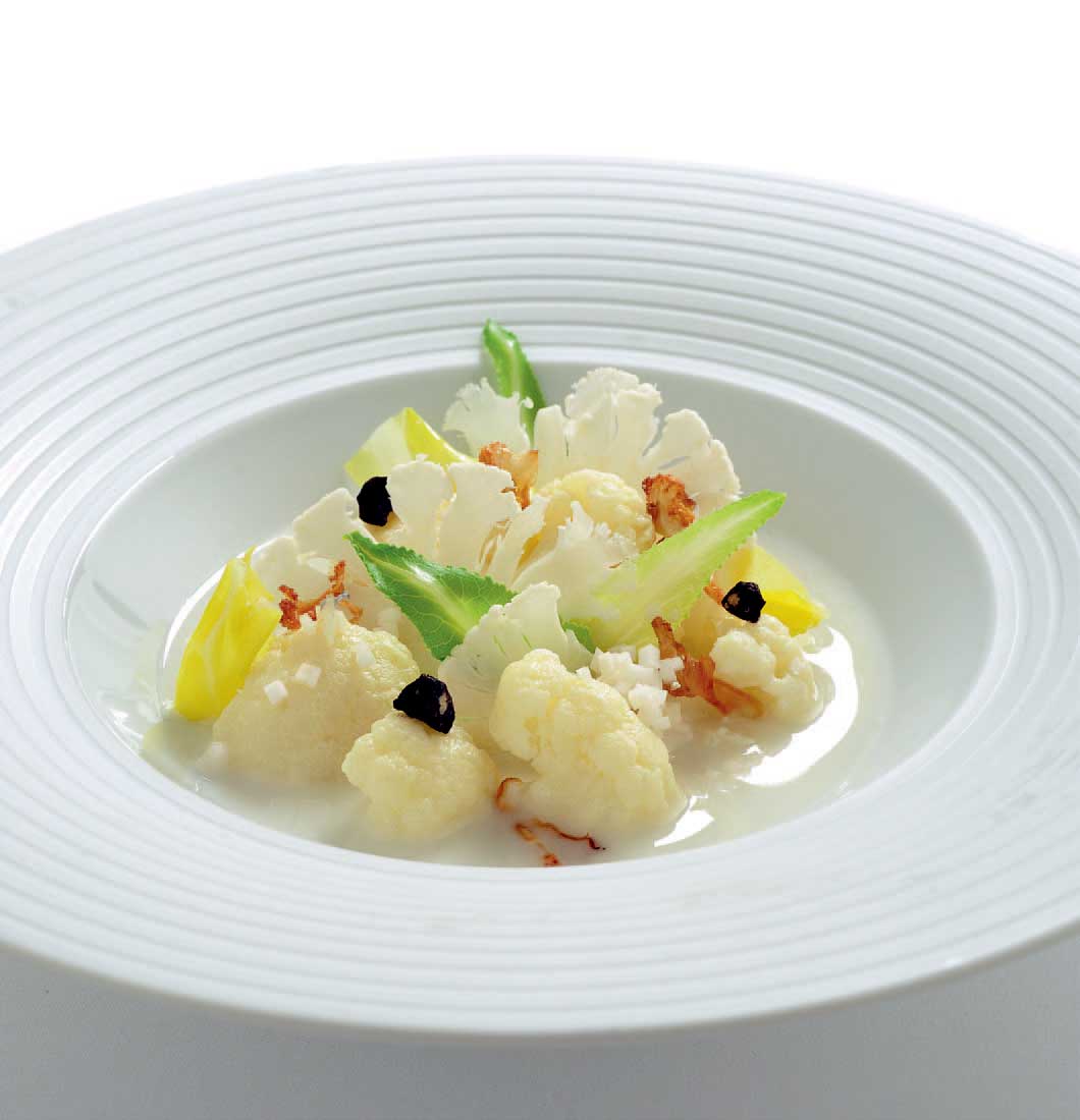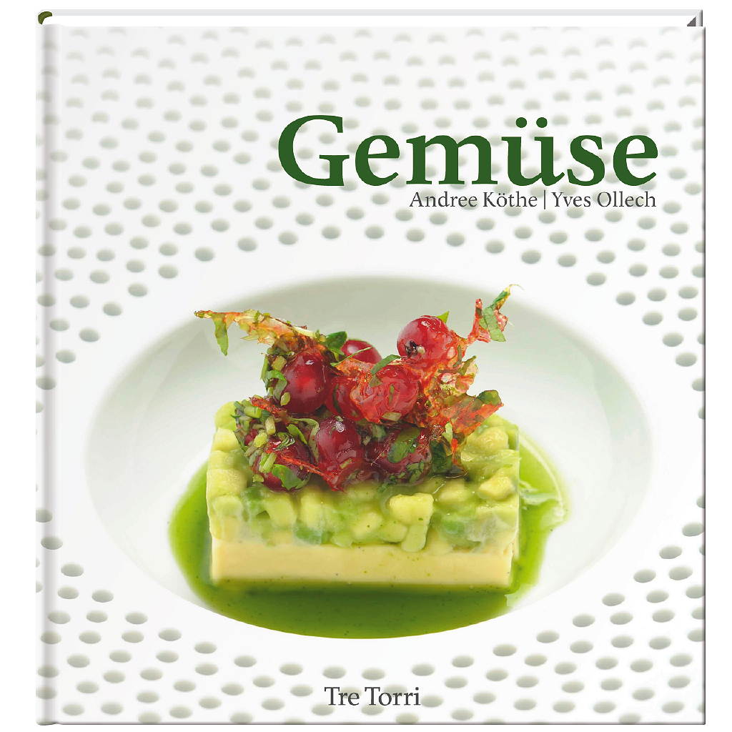 Ein Rezept das recht einfach gehalten ist, man benötigt keine besondere Küchentechnik, das aber in seiner Schlichheit beeindruckt. Es gibt Kartoffelstampf mit Kirschtomatensaft, Wildsaibling aus dem Backofen und Rhabarber. Dabei wird der Rhabarber nur geschält und in dünne Scheiben geschnitten und mit Salz und Zucker vermengt. Das bleibt etwas stehen und wird dann auf den Fisch gegeben. Ich habe das Rezept ausprobiert ( leider aber nicht mit diesem Fisch) und es war beeindruckend gut.Fast schon selbstverständlich ist, das vieles Sous Vide zubereitet wird, aber auch der Dampfgarer kommt zum Einsatz.Die Gemüse werden umfassend verarbeitet. Für den Blumenkohl gibt es Blumenkohlröschen, Blumenkohlscheiben, Blumenkohlasche, Blumenkohlblätter und Blumenkohlfond und auf dem Teller schaut das alles zusammen dann richtig gut aus:© Peter Schulte für Tre Torri Verlag